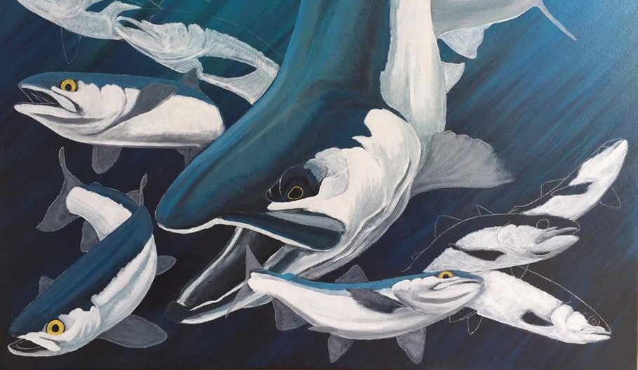 This piece has been sitting unfinished since May. This summer has been insanely busy with buying a house, moving, and guiding up in the Arctic. I’m hoping to get back to working on it in the next month or so. In the meantime, I’ll be working on the Pacific Salmon Federation stamp piece.